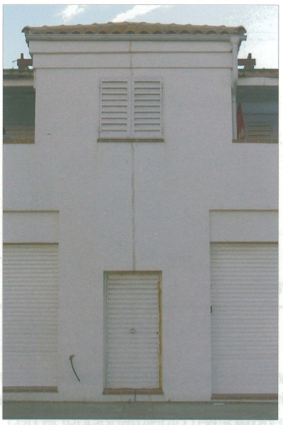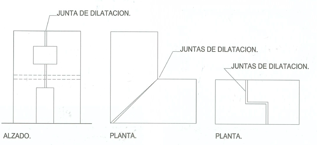 Características: En determinados casos se proyectan juntas de dilatación en lugares inadecuados, como puede ser cortando puertas, ventanas y habitaciones, tal como se indica en el alzado de la figura. También se proyectan juntas de dilatación en diagonal, que al retraer la estructura queda con distinta abertura o juntas quebradas, donde su funcionamiento es menos correcto, como se indica en las plantas de la figura. Es conveniente situar la junta de dilatación entre dos viviendas, mediante duplicidad de pilares, evitando en lo posible la colocación de ménsulas.