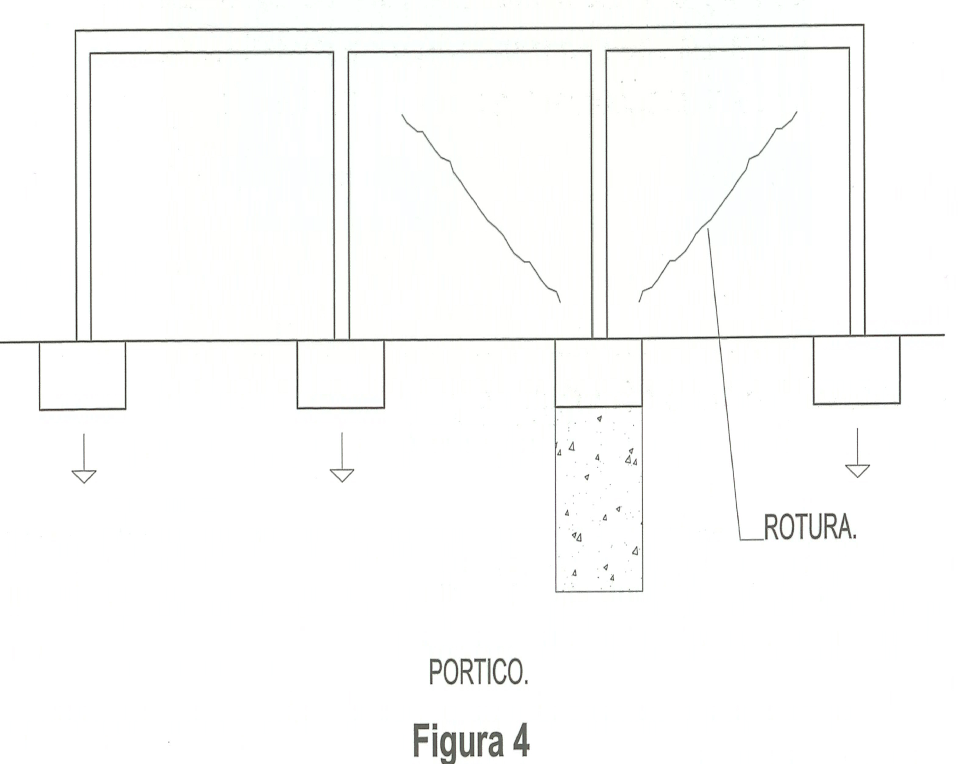 Características: Con cierta frecuencia en obras se suele cometer el error de realizar una cata o calicata en el lugar donde se va a situar una zapata, con el propósito de tener realizada la excavación. Esta práctica se debe evitar, ya que esa zapata queda a mayor profundidad que las demas y con frecuencia sobre terreno más consolidado con mayor capacidad portante, lo cual ocasiona asientos diferenciales al tener menor descenso y surgen fisuras de tracción diagonal en los tabiques y cerramientos que se alejan del pilar de forma ascendente (figura 4). Sucede lo mismo que cuando se ejecuta la zapta sobre restos de cimentaciones.