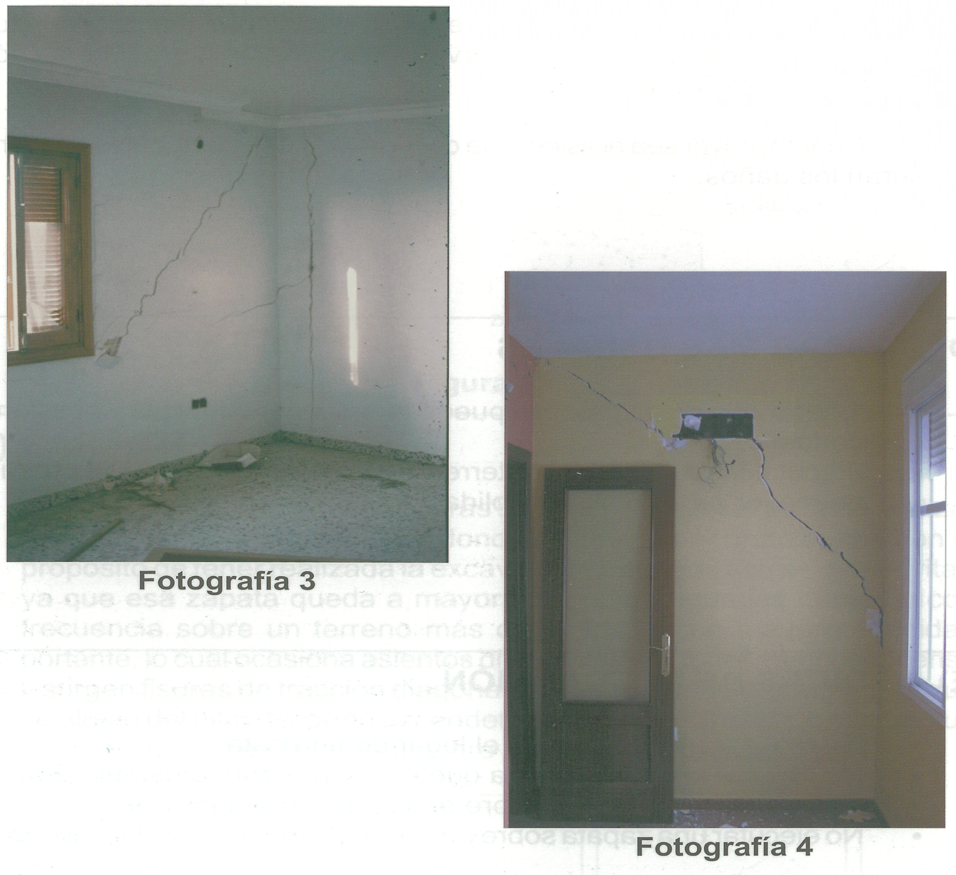 Los descensos por ejecutar zapatas en zonas de catas suelen ser pequeños y ocasionan sólo fisuras o pequeñas grietas, como las de las fotografóas 3 y 4. Se suele llamar fisura cuando la abertura es inferior a 2 mm o solo es superficial y no corta el elemento, como sucede en las fisuras de retracción por afogarado. Cuandio las abertura es superior, se le suele llamar grieta.