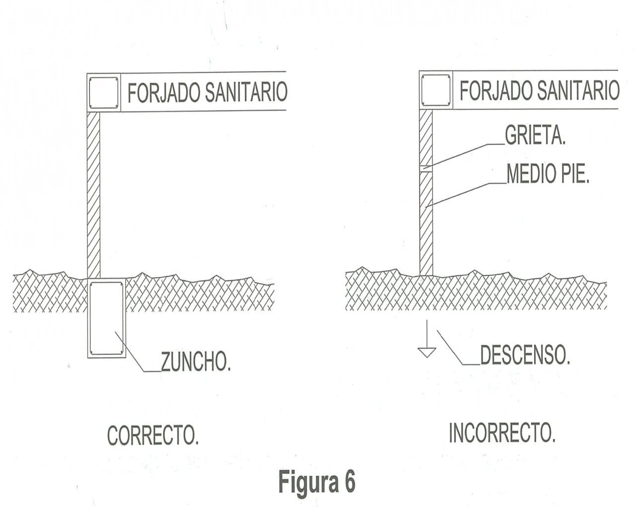 Características: Los forjados sanitarios cuando quedan elevados sobre el terreno, precisan de un cerramiento en fachada bajo el forjado para que no quede la cámara al descubierto. Este cerramiento debe decansar sobre un zuncho que ata las zapatas, como se indica en la figura 6. Cuando no se coloca coloca dicho zuncho de apoyo, al pasar el tiempo y desecarse las tierras en la que apoya el cerramiento, éste desciende y aparece un grieta longitudinal, que aunque se tape, como el descenso continúa, volverá a romper. También se pueden colocar perfiles colgados del forjado y apoyar en su zona inferior el cerramiento.