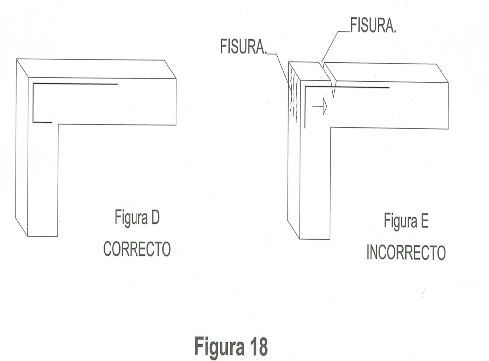 Características: En las vigas planas con barras de >20 mm de diámetro, necesitan mayor longitud de anclaje que excede de su canto y precisa doble patilla, dificultando su elaboración, figura D. Si se coloca sólo una patilla, al tener menor longitud de anclaje intenta deslizar y salir la patilla por el lateral de la viga, apareciendo fisuras verticales como las que se indican en la figura E. Más adelante cuando deslice totalmente la armadura, romperá a flexión por su cara superior. Si no se desea colocar doble patilla se puede optar por lo siguiente: Reducir el diámetro de la barras, si el número de barras no cabe con la separación adecuada, ensanchar la viga o colocar la armadura en dos capas, aumentar el número de barras en más de lo necesario para que la suma de todas cumplan con la longitud de anclaje, colocar las patillas en diagonal con su longitud de anclaje.