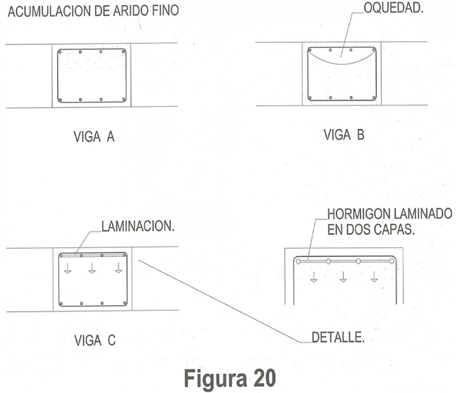 Características: Los vibrados defectuosos o insuficientes son frecuentes en elementos mal predimensionados con armadura excesiva, como sucede en vigas de dimensiones muy reducidas, dado que al llegar a los pilares la armadura no tienen espacio para pasar entre las barras del pilar y hay que colocarlas muy unidas o en dos capas, donde tiene bantante dificultad el hormigón para penetrar. Estas vigas cerca de los pilares , una vez vibradas, presentan los inconvenientes siguientes: El hormigón de la zona superior queda más fluido, se produce mayor asentamiento plástico y las barras quedan con menos adherencia. Se producen oquedades que dejan a las barras con menos adherencia y queda la viga con menos resistencia a cortante. Sl descender el hormigón se puede laminar y quedar dividida en dos capas, lo cual le afecta a la adherencia de la armadura y ocasiona mayor deformación. Estos problemas no se aprecian a simple vista, por lo que se le debe prestar más atención.
