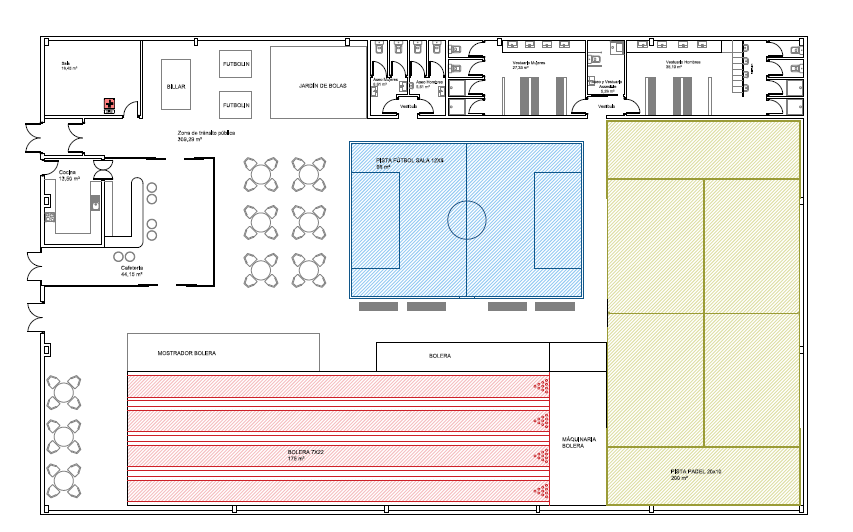 Proyectamos sobre una sola planta las necesidades de nuestro cliente: zona de tránsito público, sala, zona de ocio, aseos de mujeres, aseos de hombres, vestuario mujeres, vestuario hombres, aseo y vestuario de minusválidos, pista de pádel, pista de fútbol sala, 4 pistas de bolos y cafetería con su cocina y su terraza interior.