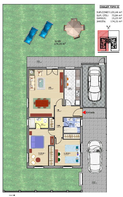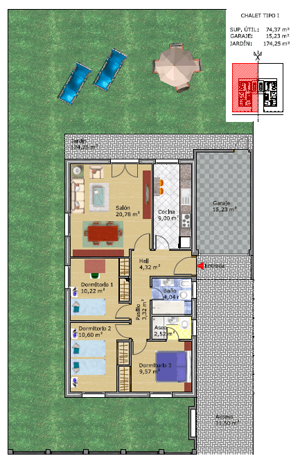 El diseño se completa con un amplio espacio ajardinado de 170,00m² en el lateral y la parte trasera de las viviendas, el cual cobra gran protagonismo dentro de la parcela.
