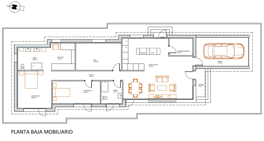 En esta ocasión la parcela irregular de 1.200,00 m² se encuentra diáfana y sin edificaciones y el programa de necesidades de la vivienda responde a salón-cocina, 2 cuartos de baño, 2 dormitorios uno de ellos con vestidor, 1 sala, 1 despensa/calderas, pasillo y garaje.