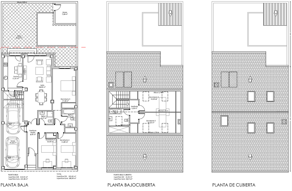 La nueva construcción se desarrolla en planta baja (cocina, salón, 2 cuartos de baño, 3 dormitorios y garaje) y planta bajocubierta (2 dormitorios, un vestíbulo y un baño), sobre una parcela de 220 m², se reserva el fondo de la misma como patio donde se ubica un pequeño cuarto anexo.