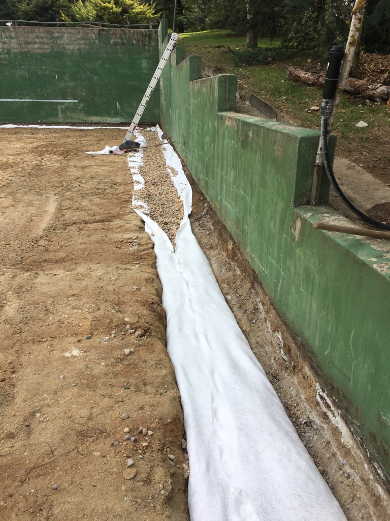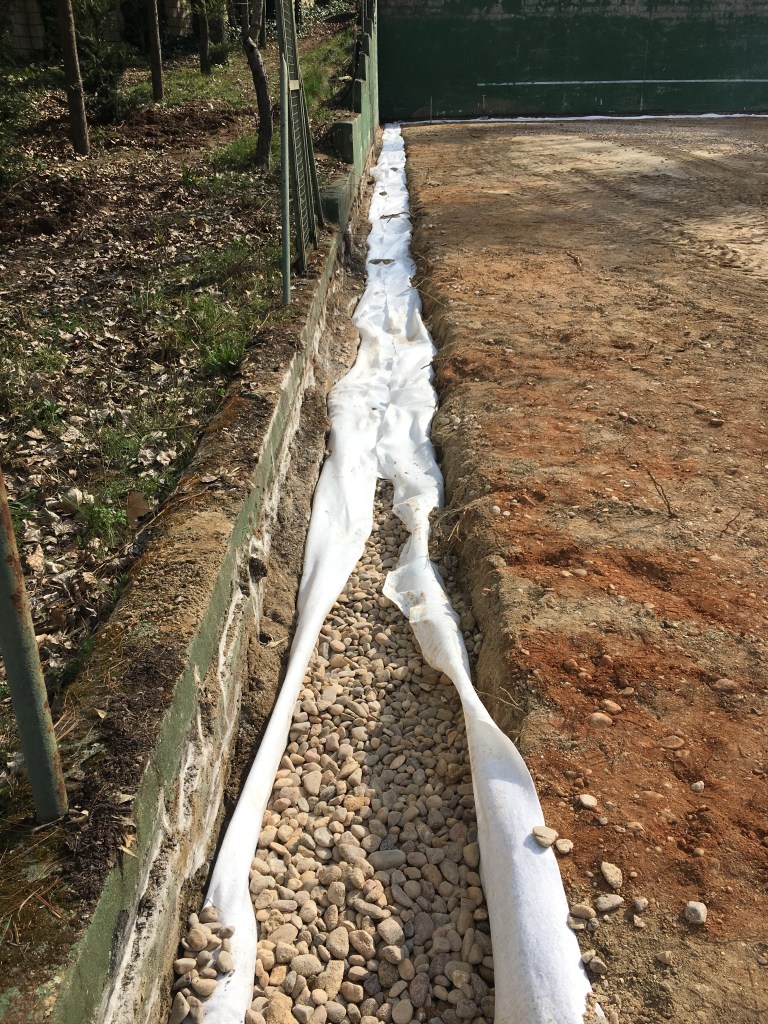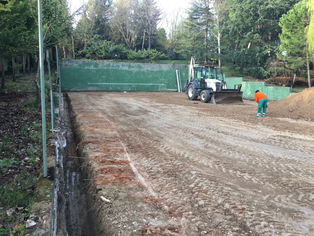Se realiza una zanja perimetral de drenaje en donde alojamos una tubería de PVC ranurada, un relleno de canto 60/80, y una manta de geotextil de 200gr/m2 envolviendo toda la zanja. Además preparamos la base nivelando la superficie con un 0,5-1% de pendiente hacia el perímetro, sobre la cual se extiende un encachado de 25cm de material reciclado (ladrillo, cerámica, hormigón) velando por los sistemas ecológicos que protegen el medio ambiente. Sobre este encachado se coloca una manta de geotextil del mismo gramaje que el anterior, y como capa final 15cm de arena de sílice de aristas vivas y granulometría 0,01mm.